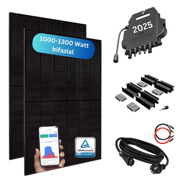 Die Ausgangsleistung darf max. 800 Watt betragen. Die Solarmodulleistung hingegen darf auch etwas höher sein, sodass wir Sets mit unterschiedlich großen Modulgrößen anbieten. Vom Standardmaß bis hin zu XXL Modulen.